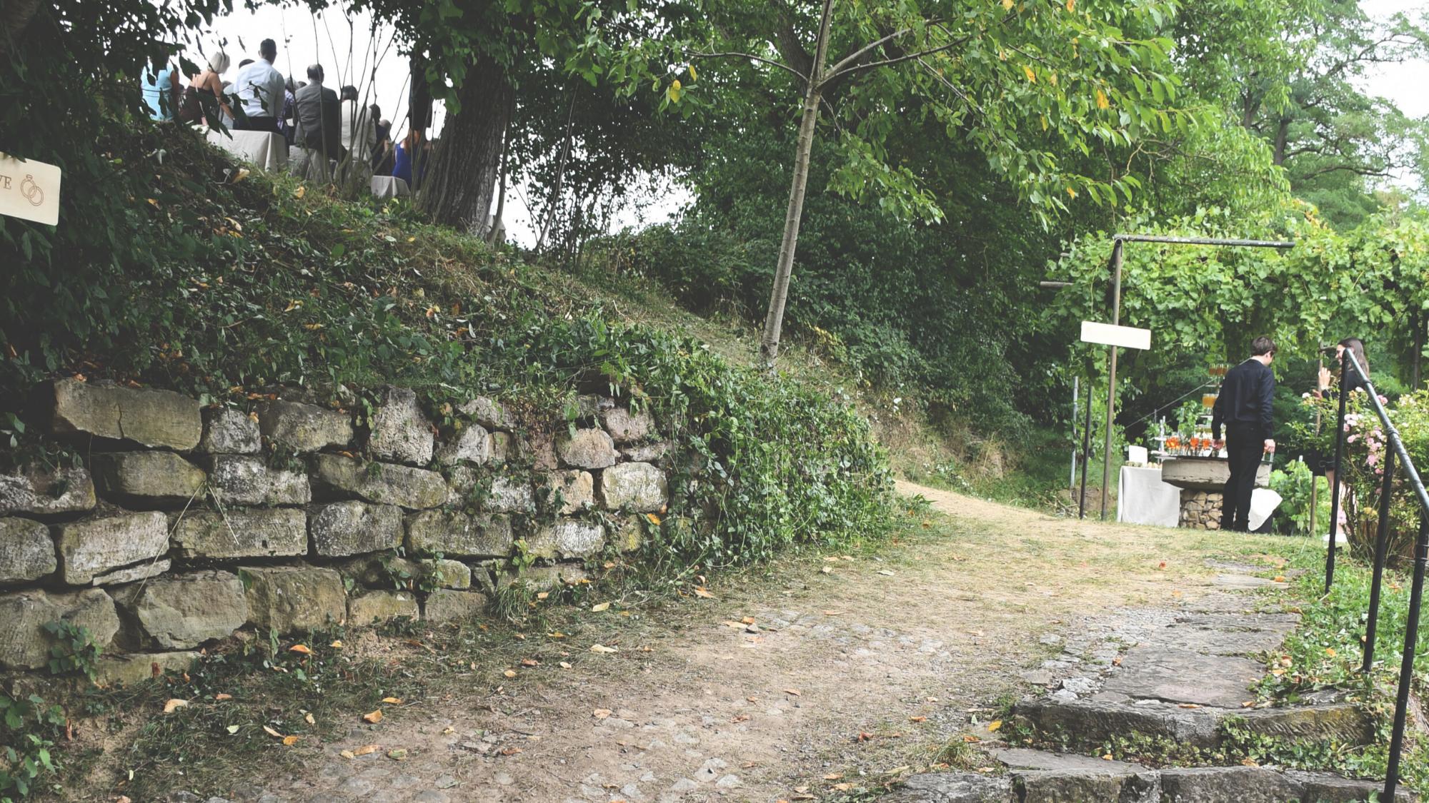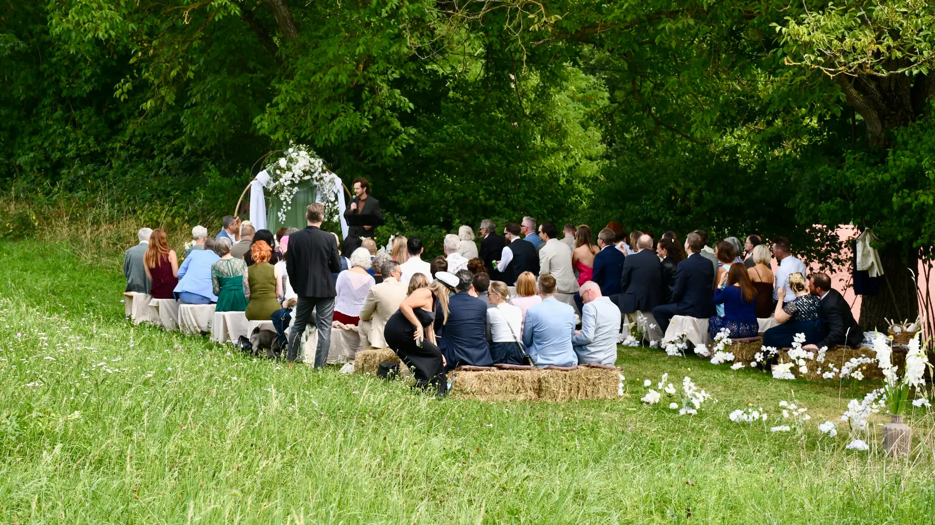 Auf der Wiese am Weinberg gebt ihr euch das Ja‑Wort – eingerahmt von Nussbäumen, Rosenbogen und dem historischen Mühlstein. Die Bestuhlung und Dekoration sind frei gestaltbar, vom intimen Setting bis zur großen Runde.